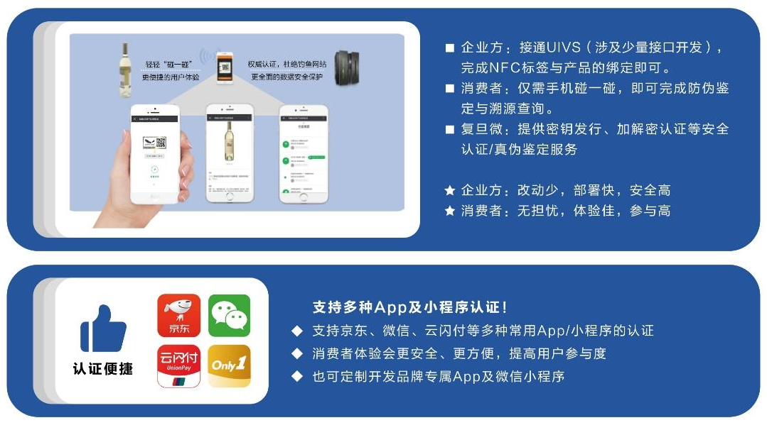 為了讓企業更便捷地用上PUF芯片指紋技術,復旦微提供UIVS(Uniqueness Issuance and Validation Services),即“唯一性發行與認證服務”,這是一項圍繞PUF芯片應用的安全系統解決方案,旨在為客戶提供PUF芯片相關的密鑰生產發行、云認證、跨域互通以及可信存證服務。且UIVS服務支持多種App/小程序的認證,即消費者直接使用京東app、銀聯云閃付app、微信小程序、真品無雙、品牌定制app/微信小程序即可實現快速認證和溯源查詢。 UIVS服務采用SAAS標準模塊,可與企業現有的應用系統直接快速對接,最快一周實施上線。或者企業可選擇基于UIVS的全套防偽溯源系統,即“真品無雙”防偽溯源系統,該系統包括UIVS發行與認證系統、數據系統、及“真品無雙”及企業定制app及小程序,客戶可直接使用。 目前PUF芯片防偽溯源服務已應用于知名煙酒茶品﹑藥品食品﹑工藝收藏﹑鑒定證書﹑潮牌運動﹑奢品家居﹑電商平臺﹑安全物聯﹑互娛周邊等眾多領域。