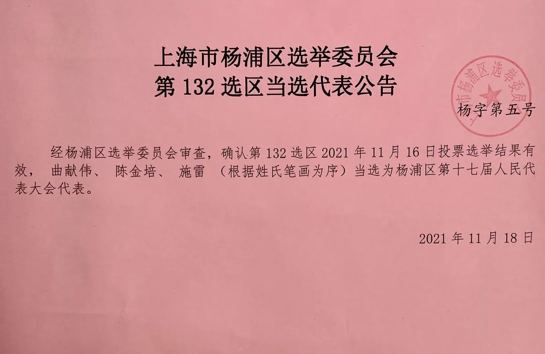 經楊浦區選舉委員會審查,確認第132選區2021年11月16日投票選舉結果有效,上海復旦微電子集團股份有限公司董事總經理施雷當選為楊浦區第十七屆人民代表大會代表。
